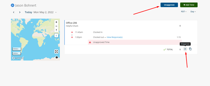 You may notice some shifts get marked with an error called Unapproved Time and come up as "0 hours" even when employees have worked a shift. This means the day was approved before an employee worked that day. Now an employee has tracked time against a day that has essentially been locked because it was approved. Since that time period has been marked as approved, this locks the date range and does not allow any more edits, new shifts, new PTO requests, or anything to alter the hours for that week.