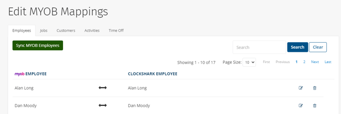 - To map an MYOB employee to ClockShark, click the Edit icon and select the correct ClockShark employee from the dropdown list.