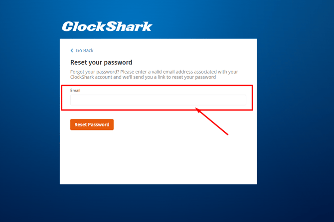 - Ingrese su dirección de correo electrónico (Email address) y luego haga clic en Restablecer contraseña (Reset Password). Su cuenta de ClockShark debe estar activa para recibir el correo de restablecimiento.
