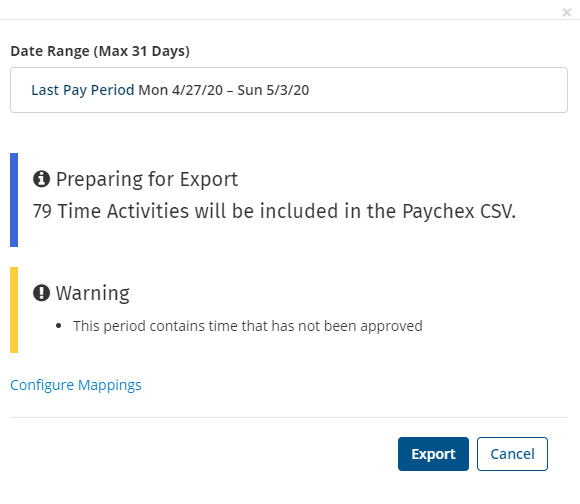 - Select the date range you want to export. If this date range is not approved or if employees are not correctly mapped, you will receive a warning.