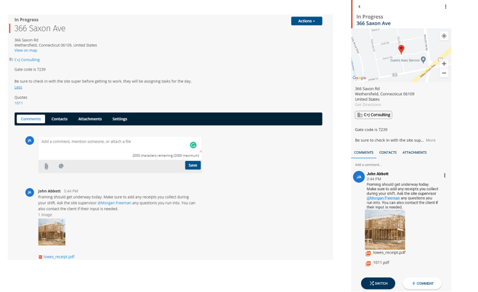 With Comments, you can easily communicate across teams on both the website and mobile app. When you create a comment on a job, anyone with access to that job can view it. This is ideal for discussing materials needed, job progress, roadblocks, and more.